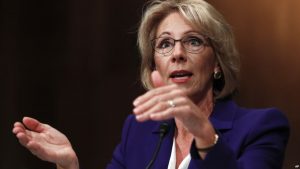 DeVos —multimillonaria, importante donante del Partido Republicano y activa en la defensa de educación privada subsidiada por el estado— enfrentó una fuerte oposición de los sindicatos de maestros y otros grupos liberales que la acusaron de no tener ninguna experiencia en educación y de ni siquiera haber estudiado en una escuela pública ni enviado a sus hijos a una institución de ese tipo.