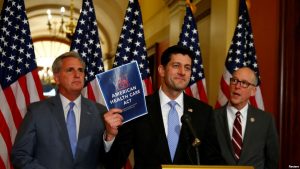 En un mitin frente al Capitolio, los demócratas denunciaron la intención republicana de derogar la reforma aprobada bajo el gobierno anterior. La nueva versión, aseveraron, eliminaría los aumentos de impuestos aplicados a gente acaudalada y a las grandes empresas, y reduciría la asistencia económica a gente de bajos ingresos además de limitar el alcance del programa asistencial Medicaid, que beneficia a retirados e indigentes.