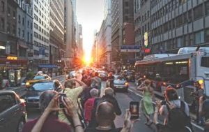 El fenómeno, que se origina solo cuatro veces al año, es cuando el sol poniente se alinea con las calles este-oeste de la rejilla principal de Manhattan. El sol es visible en el horizonte desde el nivel de las calles al estar alineado con su trazado.