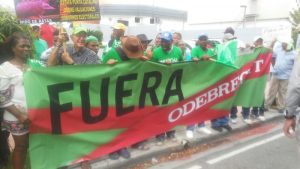 Durante la demostración, los manifestantes portaron banderas verdes y letreros con consignas contra la empresa brasileña, que reconoció haber distribuido 92 millones de dólares en sobornos a funcionarios para que le asignaran obras públicas en este país.