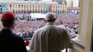 Por su parte, el presidente de Colombia, Juan Manuel Santos, agradeció la visita y recordó el largo trayecto recorrido por su país: “Por más de medio siglo nos resignamos a la violencia en nuestro suelo, y sus cenizas –de rencor, de dolor, de venganza– todavía son brasas ardientes que debemos apagar”.