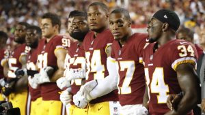 WASHINGTON, Distrito de Columbia.- Centenares de jugadores profesionales de fútbol americano de la NFL se hincaron, se unieron de brazos o permanecieron en los vestidores el domingo durante la interpretación del himno nacional de Estados Unidos antes de sus partidos, en respuesta a tres días seguidos de pedidos del presidente Donald Trump para que despida a quienes irrespeten los símbolos patrios.