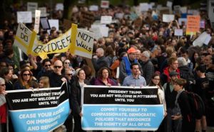En las cercanías de la sinagoga de la Congregación del Árbol de la Vida, escenario del fatal suceso, los manifestantes portaron carteles en rechazo al jefe de la Casa Blanca y pidieron que se marchara pues no era bienvenido.