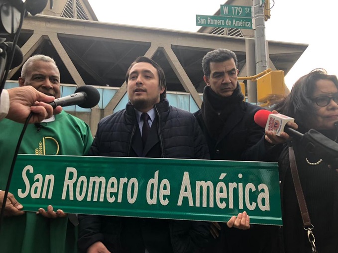 NUEVA YORK, Nueva York.- El concejal Ydanis Rodríguez hizo renombrar la calle 179 esquina Fort Washington, en el Alto Manhattan, como «San Arnulfo Romero de América Way», en honor al Arzobispo Arnulfo Romero, asesinado el 24 de marzo de 1980 durante una eucaristía en su iglesia en El Salvador.