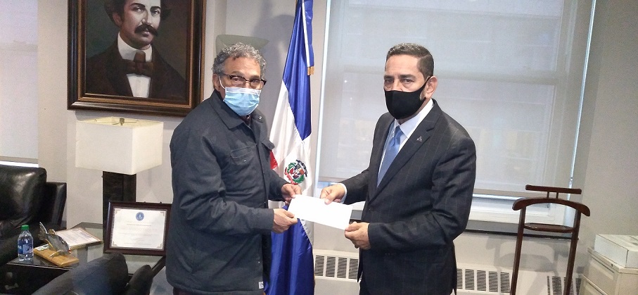 Pie de Foto: El señor Eligio Jáquez, Cónsul dominiano mientras entrega un cheque al director de deportes, Manolo Prince para cubrir los gastos del funeral del deportista Hugo Cabrera.