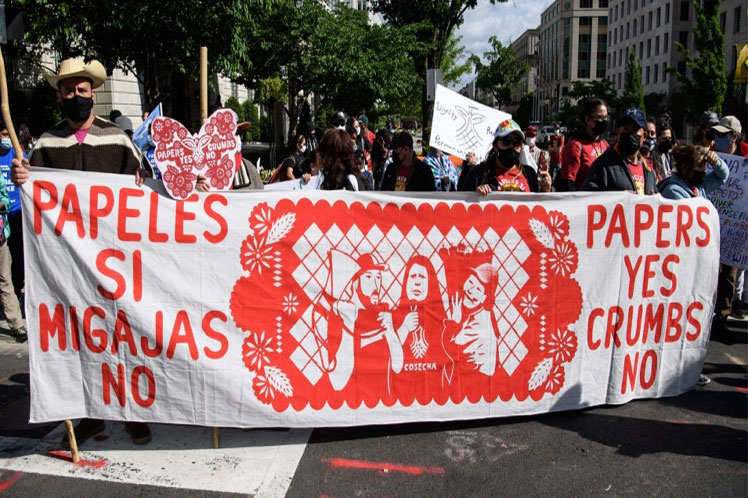 Papeles sí, migajas no, gritaron los participantes en la manifestación, y subrayaron también que el mandatario demócrata no ha cumplido sus promesas electorales aunque ya estuvo 100 días en el cargo.