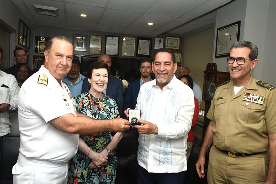 En el marco de la visita de 106 tripulantes entre ellos 35 oficiales de la Armada Dominicana, antigua Marina de Guerra y durante un encuentro en la sede consular dominicana, el Cónsul Eligio Jáquez entregó el escudo de la República incrustado en una piedra de larimar, el cual fue colocado en la zolapa del uniforme militar al Teniente General Carlos Luciano Díaz Morfa, ministro de la Defensa en la República Dominicana, al jefe de la Armada Dominicana, vicealmirante Ramón Gustavo Betances Hernández, al agregado militar ante la ONU, general Fernando Hernandez, vicealmirante Labort, así como los capitanes de Navíos comandantes C/N Belliard Gonzalez, patrullero de altura PA-301 del barco “Almirante Didiez Burgos y comandante C/N Ney Gonzalez Tejeda, pertenecientes a la Armada de República Dominicana.