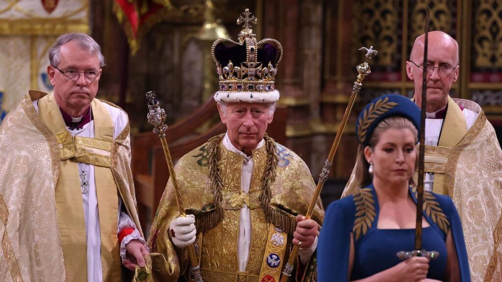 El arzobispo de Canterbury, líder espiritual de la iglesia Anglicana, colocó la pesada corona de 2,08 kilogramos y de 360 años de antigüedad sobre la cabeza de Carlos III en un procedimiento que supone la unidad de la monarquía, la Iglesia y el Estado en Reino Unido.