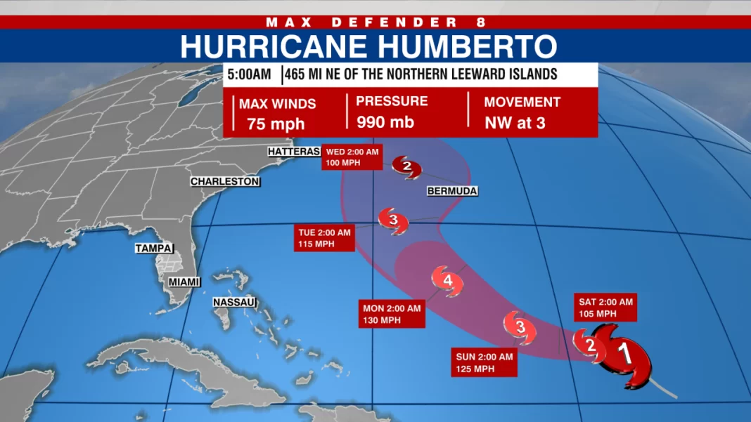 Humberto se encuentra aproximadamente a 750 kilómetros (465 millas) al noreste de las islas de Sotavento del norte y avanza lentamente en dirección noroeste.